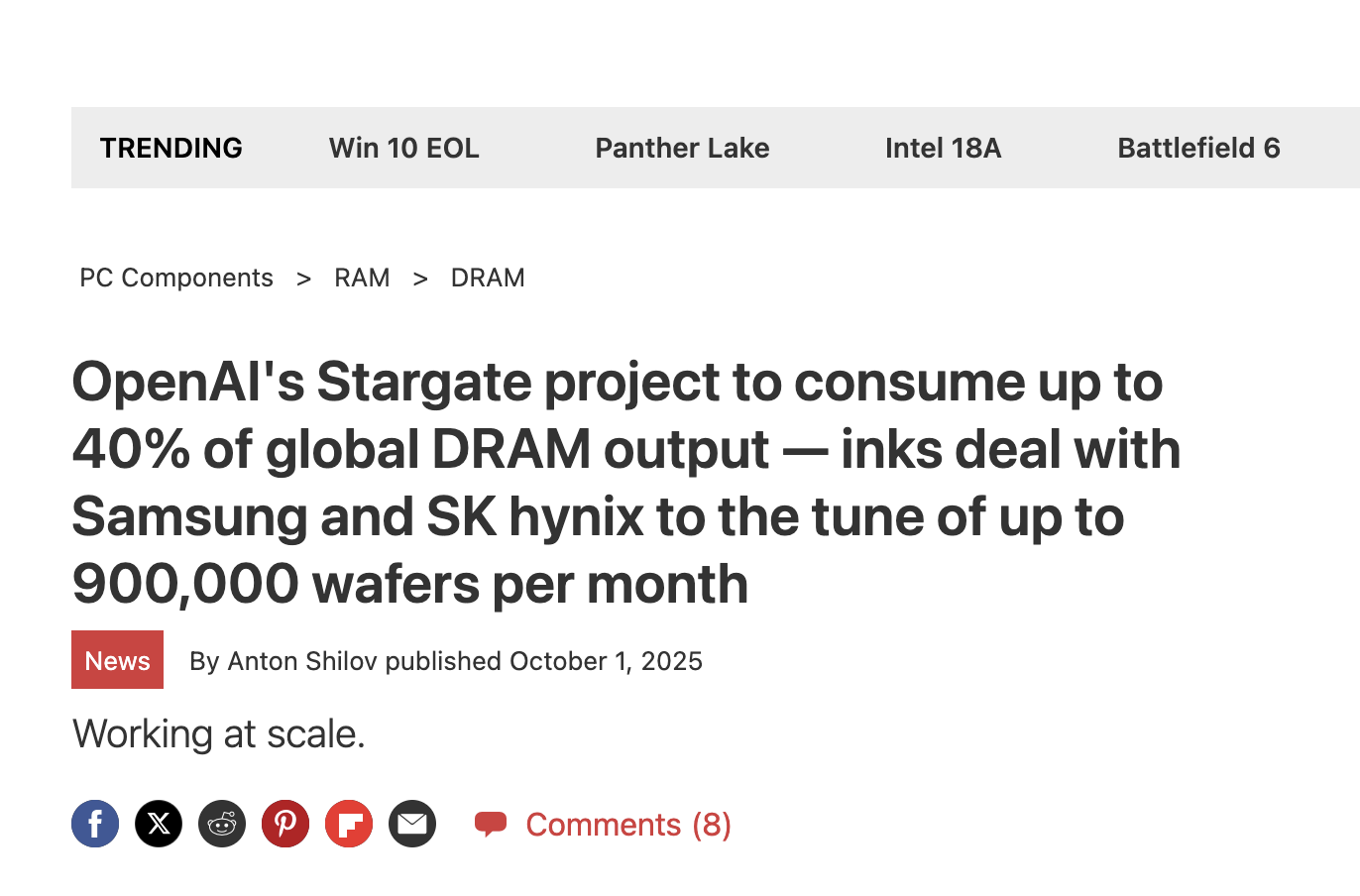 But if that all sounds too far-out for you to care, here’s the wake-up call: you are paying for it. Your “AI” pioneer “Scam” Altman just inked a deal with Samsung and SK Hynix to buy a staggering 40% of the world’s supply of memory, without an ounce of notice or concern to how badly that’s going to hurt basically everyone except him and his friends.
